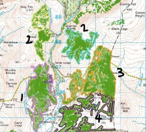 *Map shows the areas of artificial moorland drains which have been mapped by the Crichton Carbon Centre and includes the labelled phases of the peatland restoration works*